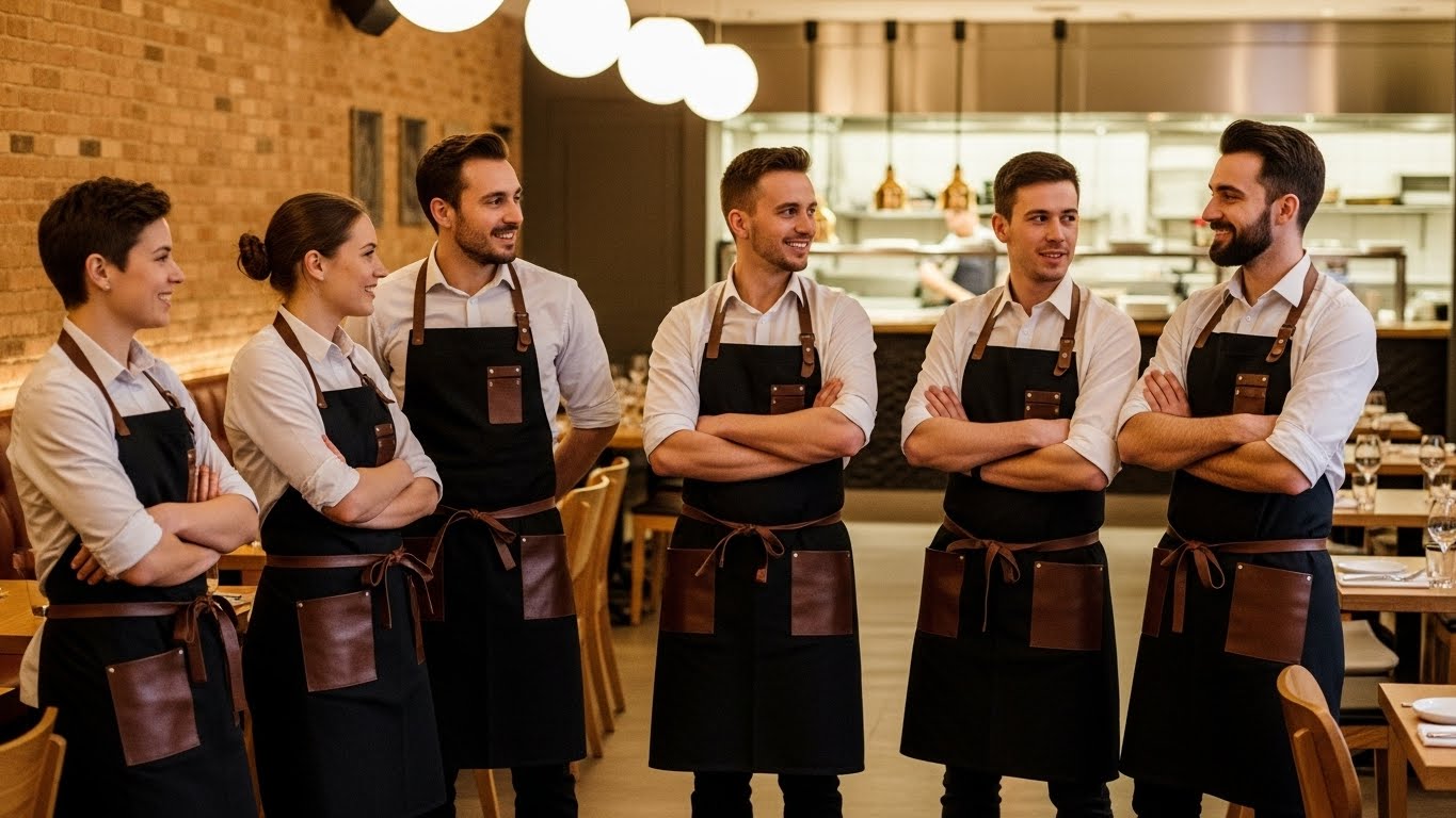 Фартук одновременно выполняет защитную и визуальную функции. Он первым бросается в глаза гостю и часто становится стилевым акцентом. Чистый, хорошо сидящий фартук усиливает образ персонала, а неудачный — сразу портит впечатление.